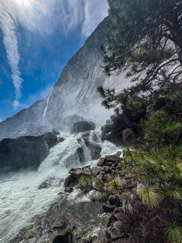 For my GA friends, this was so reminiscent of Splash Water Falls at 6 Flags over GA! As kids we would ride the ride then rush to the bridge to get soaked by the next riders. THAT was this waterfall! It was multiple bridges of water just spraying us with the power of the water as it rushed down the mountain and under us into the reservoir. What a giggle it was to get totally soaked! If you visit Yosemite, this hike is a blast!